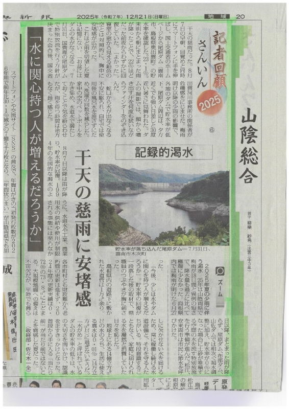 2026-01-14 山陰中央新報に掲載されました 2025年12月21日の山陰中央新報に、2025年夏にあった尾原ダム渇水のことが掲載されました。結果的にお盆前に雨が降ったので、ダムの水がなくなってしまうことはありませんでしたが、当時は水がなくなってしまうのではないかと毎日心配していました。