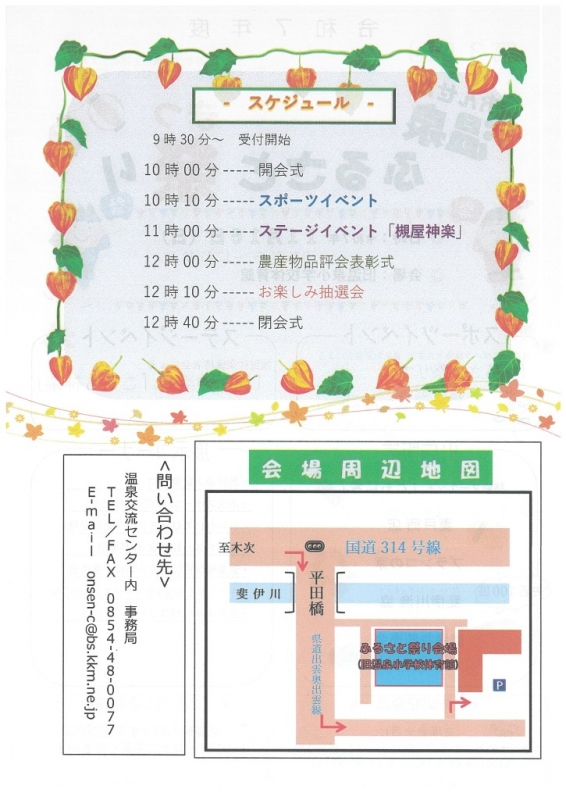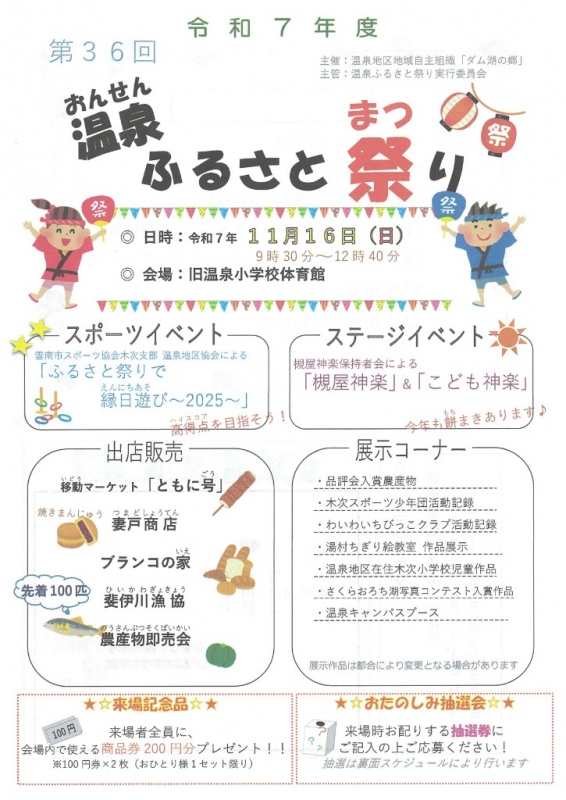 2025-11-14 【イベント情報】温泉ふるさと祭り 11月16日(日)、雲南市の旧温泉小学校体育館にて、『第36回温泉ふるさと祭り』が開催されます。出店や展示コーナーに加え、スポーツイベント「ふるさと祭りで縁日遊び~2025~」もあり、参加して楽しめそうです。 ★イベントのチラシはコチラ★