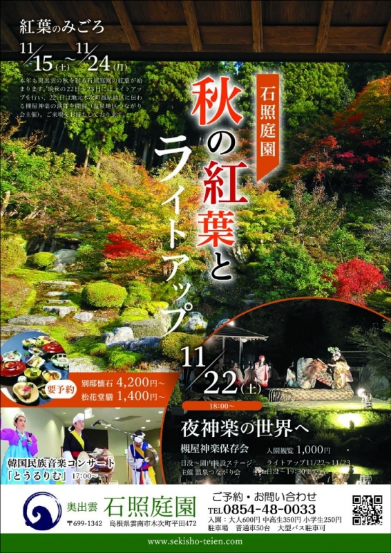 2025-11-20 【イベント案内】秋の紅葉とライトアップ 石照庭園 11月22日(土)、23日(日)に雲南市にある石照庭園にて『秋の紅葉とライトアップ』が開催されます。また、22日(土)には、韓国民族音楽コンサート、槻屋神楽保存会による夜神楽があります。紅葉とライトアップの重なりは、大変きれいになることでしょう! ★イベントの詳細はコチラ★