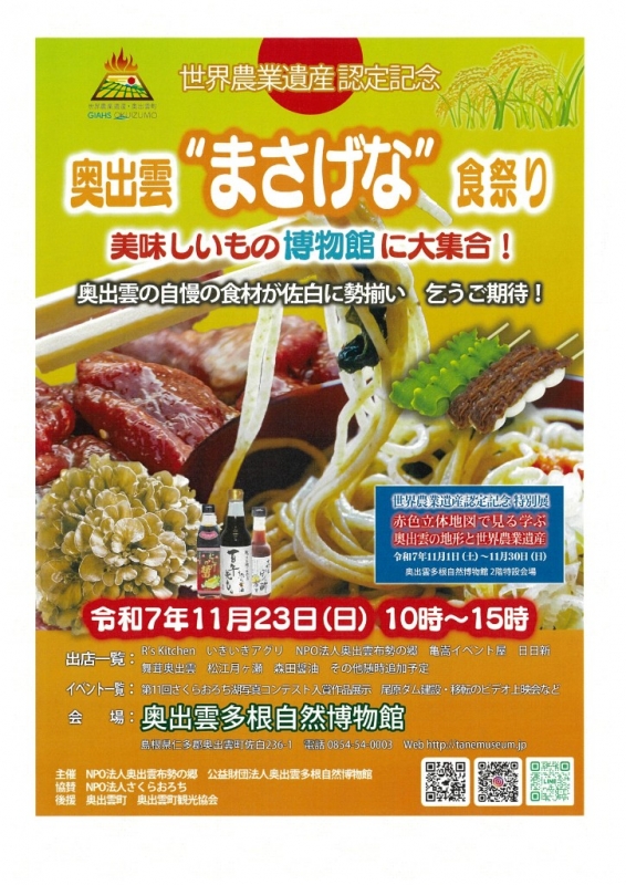 2025-11-21 【イベント案内】奥出雲“まさげな”食祭り 11月23日(日)、奥出雲町にある奥出雲多根自然博物館にて、『奥出雲“まさげな”食祭り』が開催されます。奥出雲の美味しいものが集まりますよ!あわせて、博物館では11月中に特別展も開かれています! ★奥出雲“まさげな”食祭りの詳細はコチラ★ ★特別展の詳細はコチラ★