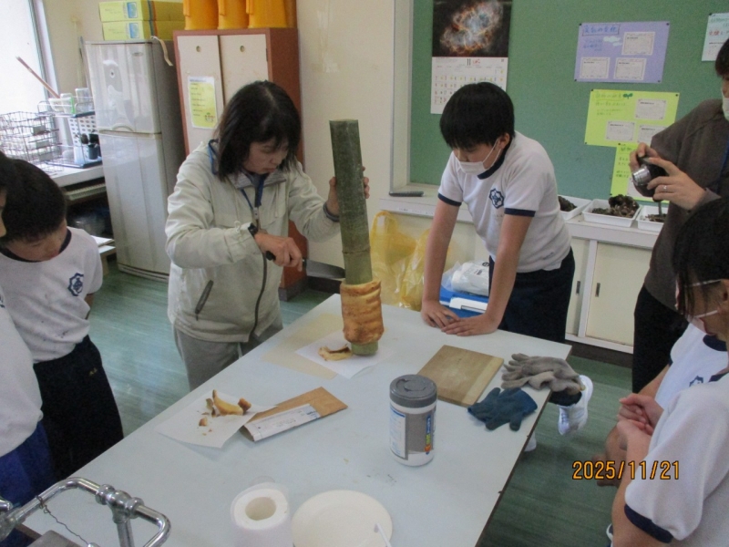 バウムクーヘン作りの後は、焼くときに使った「竹」についての話を聞きました。以前は物干し竿に使ったり、春には竹を取りに行って食べたりして竹を使っていましたが、そういうことも少なくなってきた現状があります。手入れがなされず竹が伸び放題になったところは、太陽の光が届かず他の植物が成長しないという問題があるとわかりました。問題だけでなく、竹の活用事例もお話いただきました。例えば、お皿や箸など竹の食器や竹の中に明かりを入れた竹灯籠を紹介されました。