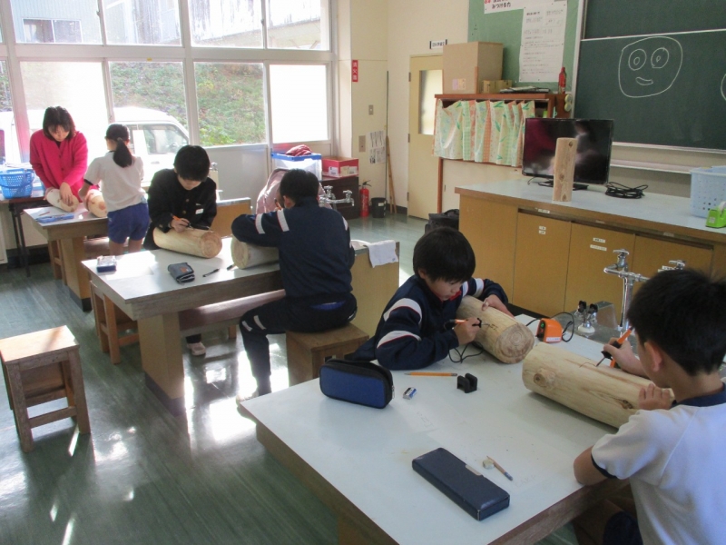 12月19日(金)、雲南市立田井小学校にて『みーもスクール』が行われました。みーもスクールは、森林保全活動の大切さを知ってもらう目的で行われています。その手段として今回は“丸太椅子の絵付け”体験と講義“森林と人工林の大切さ”からなる授業を、3,4年生の児童を対象として行いました。