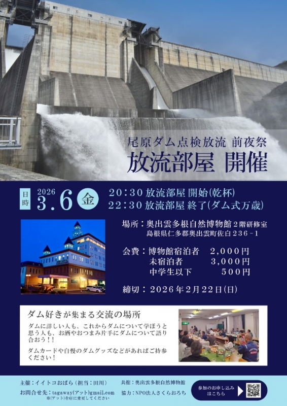 3月6日(金)、奥出雲町の多根自然博物館にて、『尾原ダム点検放流前夜祭 放流部屋』が開催されます。