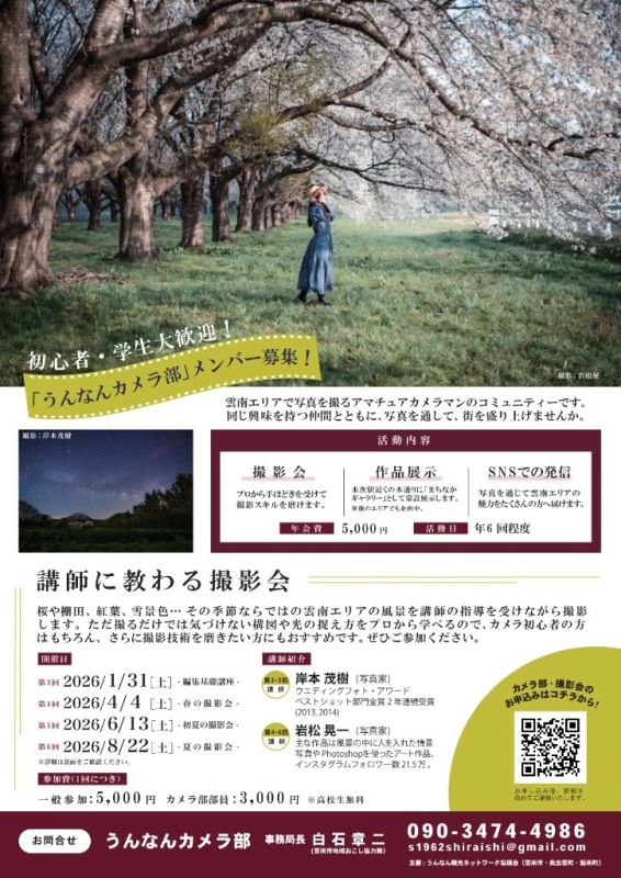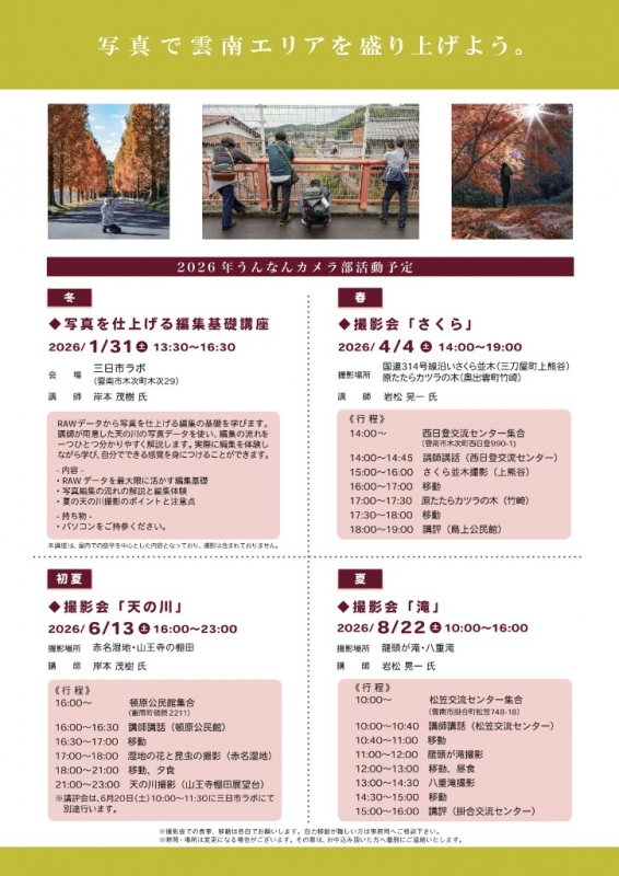 2026-01-26 【お知らせ】うんなんカメラ部 メンバー募集 雲南市で写真をとるアマチュアカメラマンのコミュニティーです。活動内容は撮影会、作品展示、SNSでの発信などがあります。また講師に教わる撮影会ということで、指導を受けることのできる日もあります。