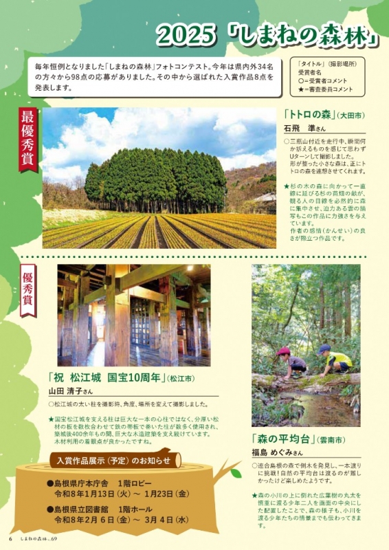 森林・林業情報総合誌『しまねの森林(もり)』No.69にて、2025「しまねの森林」フォトコンテストの結果が掲載されていました。どの作品も撮影者の方の、森林との関わりから瞬間を切り取った素敵な作品だと思いました!