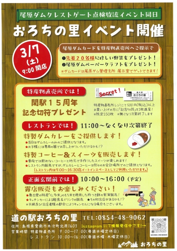 2026-02-28 【イベント案内】道の駅おろちの里 イベント開催 3月7日(土)、雲南市にある道の駅おろちの里にてイベントが開催されます。この日は尾原ダム管理支所周辺ではクレストゲート点検放流イベントが開催されます。近い距離になりますので、一方のイベントに行かれた方は、もう一方のイベントにも顔を出してみてくださいね!