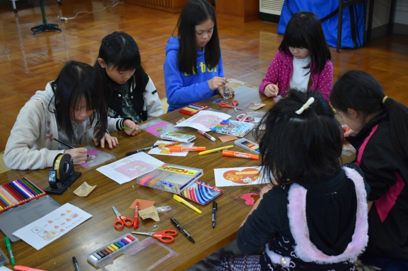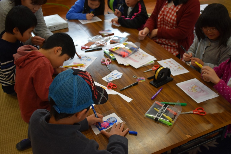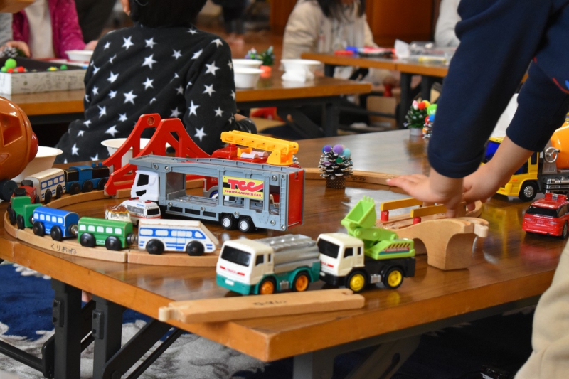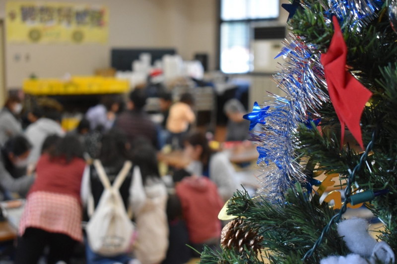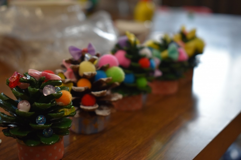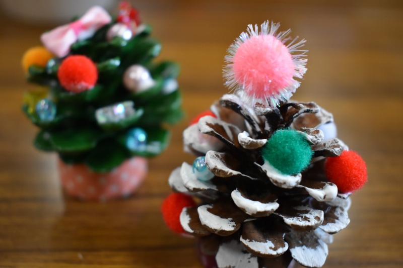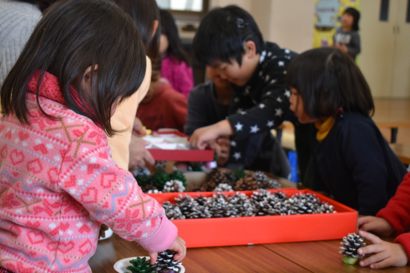 幼児はまつぼっくりのクリスマスツリー工作、小学生はプラ版工作と子供たちが喜ぶ工作時間が開かれました。