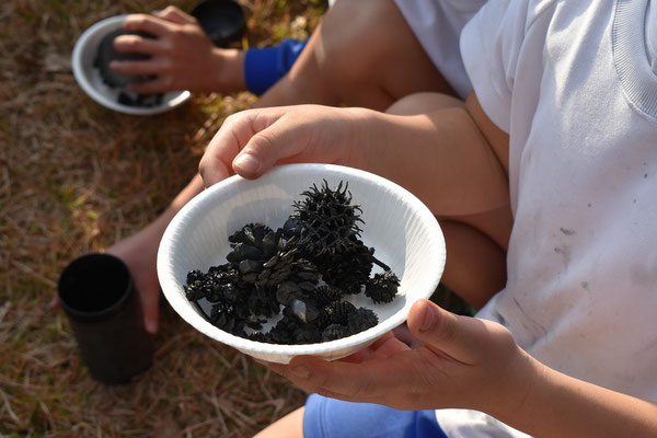 モミジバフウ・松・どんぐり・ヒノキ・スギなどの木の実を金属の筒に入れ、焚き火にかけて熱します。