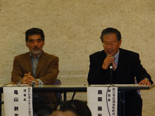 第一部ではNPO法人さくらおろち亀山理事長と松江市の白潟本町町内会の森脇副会長によるトークショー