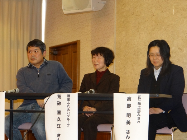 第二部では食べごと塾の講師・事務局として運営に携わってきた料理研究家の行友さん/温泉ふれあいグループの荒砂さん/株式会社 味工房みざわの高野さん/篤農家の響さん/NPO法人さくらおろちの藤原さんによるパネルディスカッション