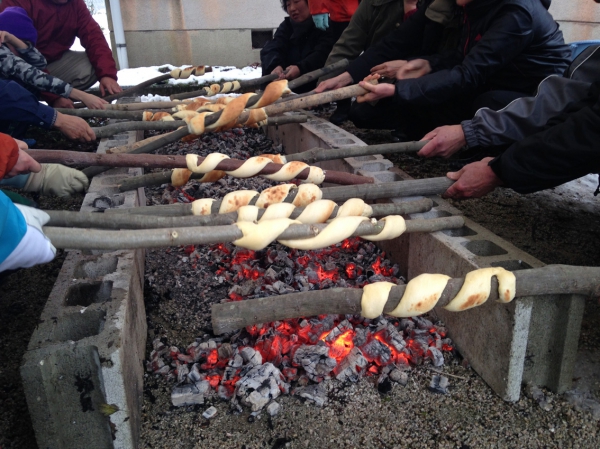 ▲炭火で棒焼きパンづくり。なんの木かわかりますか?