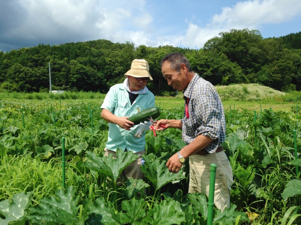 農場の野菜はズッキーニ、アスパラガス、コリンキー、茄子、トマト、キュウリ、ヤーコン、子どもピーマン、ステビア、ほおずき……と実に多品目。