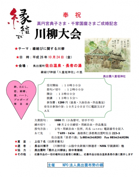 高円宮典子さま・千家国麿さまのご成婚を記念して、NPO法人奥出雲布勢の郷の主催による川柳大会が、奥出雲の佐白温泉・長者の湯で開催されます。