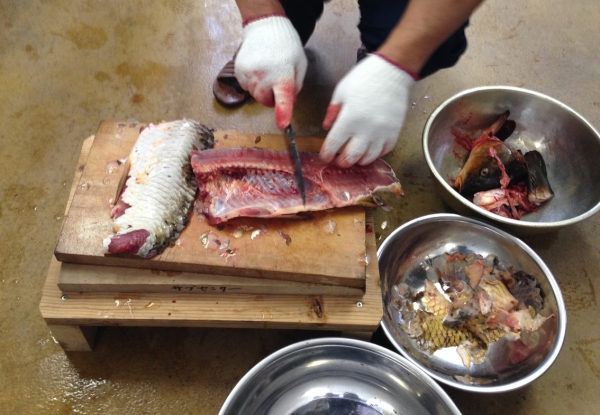 なにはともあれ、さばかねば、はじまりません。2枚におろし、骨付きで切り分けます。内臓だけはすてましたが、鯉には捨てるところがないということで、食べられるそうです。ウロコはこそげ落として、油であげて、塩をまぶせば、かりっとしたせんべいができあがり。