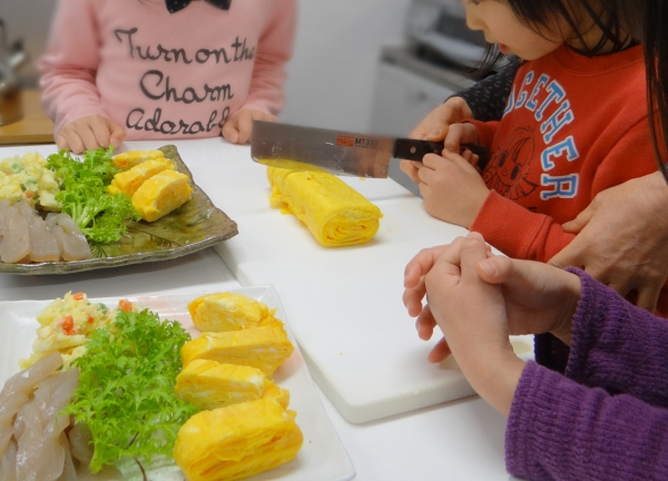 尾原地域づくり支援センターにて卵焼きづくりを手伝ってみるの図。