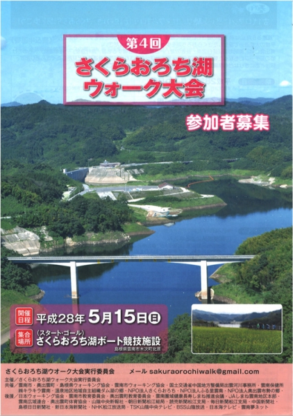 2015-12-26 さくらおろち湖ウォーク大会2016 参加者募集中です。 5月の陽気にあわせて湖畔の散歩はいかがでしょう。 詳細はチラシPDFをご覧ください。 ●さくらおろち湖ウォーク大会要項&申込書