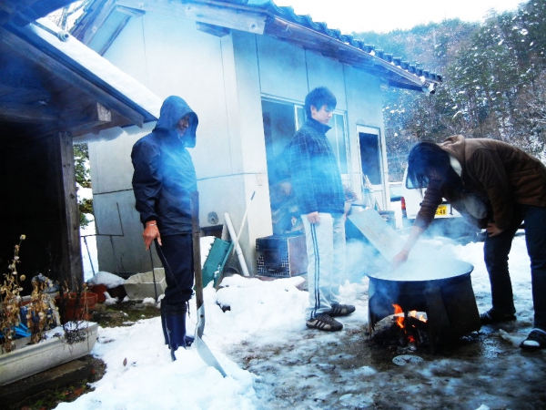 ↑雪の積もる中、昔ながらのとうふ作りを体験!